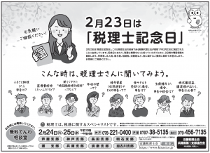 2026年1月27日 / 最終更新日 : 2026年1月27日 近畿税理士会神戸支部 事務局 イベント 税理士記念日事業「税金でんわ相談室」を開催します。(令和8年2月24日・25日) 令和8年2月24日(火)・25日(水)お電話による「税金でんわ相談室」を開催します。今年も開催します。お気軽にお電話ください‼ 開催時間 : 10:00~16:00税金について、どのようなご相談でも結構です。お気軽にお電話ください。神戸会場 078-221-0400(クリックいただくと大きな図でご覧いただけます。)